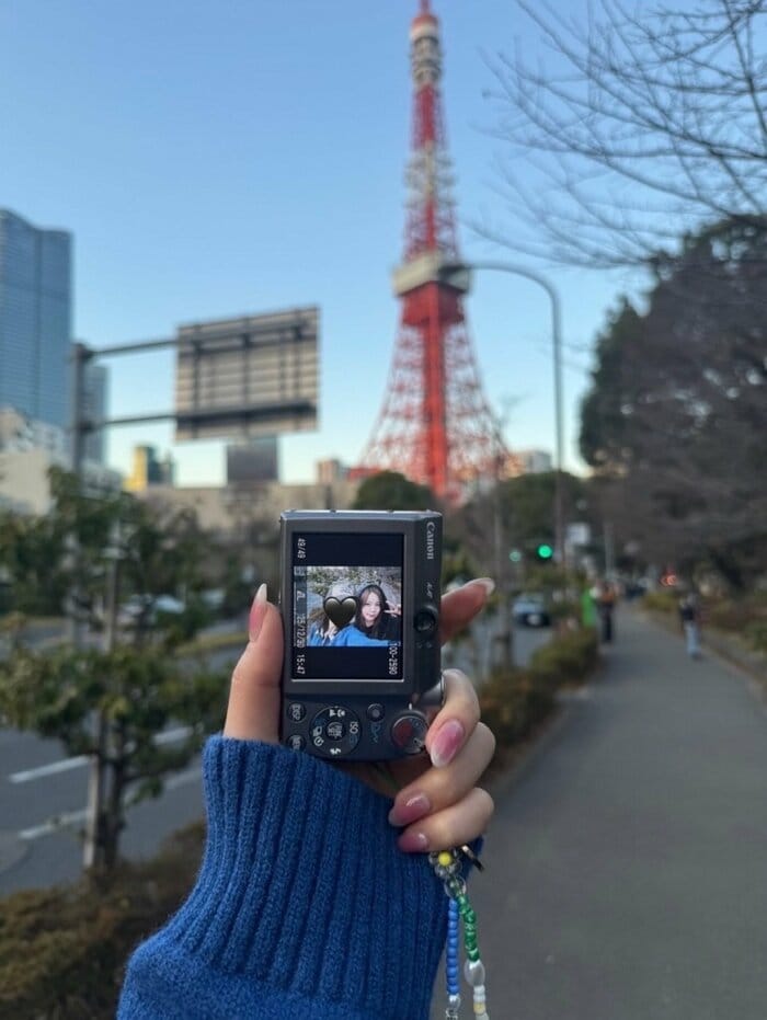 手元のカメラをよく見てみると、AYAKAさんがフードをかぶりながら、街中でピースする姿が小さく写っていて、楽しそうな雰囲気が伝わってきます。