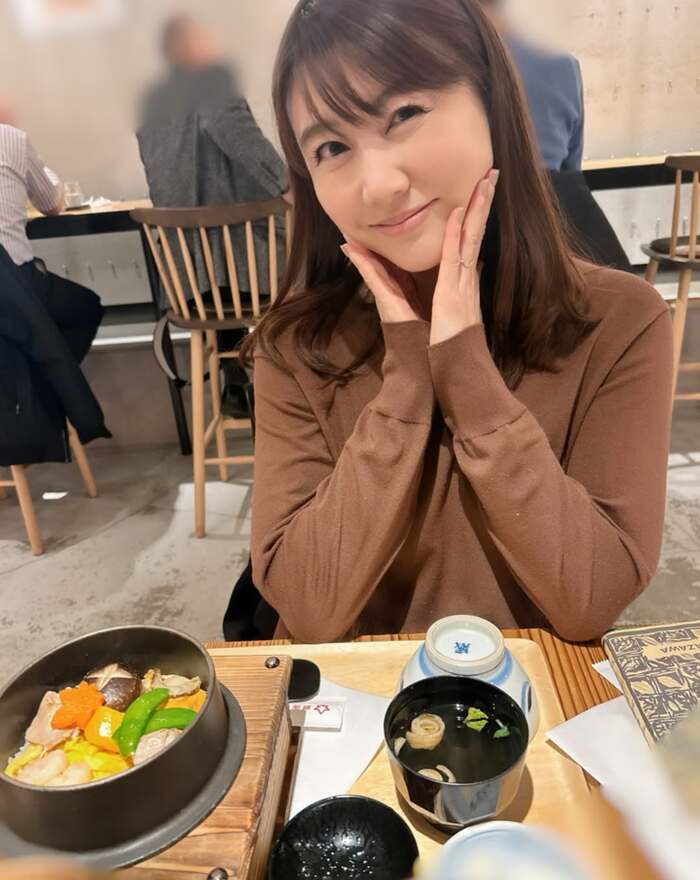写真には、茶色の長袖ニットを着た安さんが、木製のテーブルと椅子が並ぶカジュアルな飲食店で食事を楽しむ様子が写っています。テーブルの上には、色とりどりの具材が盛られた釜飯や汁物が並び、料理を前に両手を頬に添えながら穏やかな微笑みでカメラを見つめる表情を見せています。