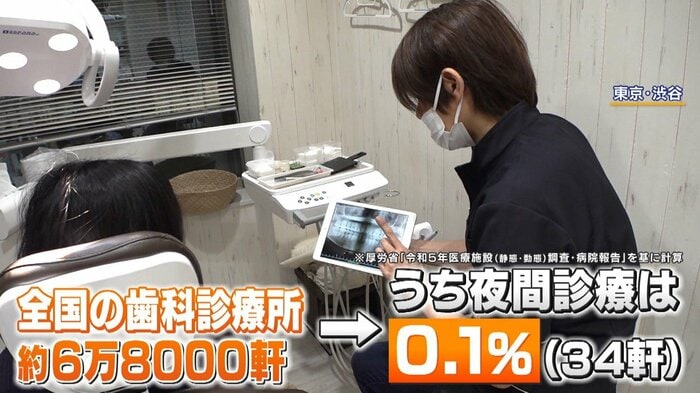 全国にある約6万8000件の歯科診療所のうち、深夜帯に診療しているのは、わずか0.1%。一体どんな人が訪れるのか、『サン!シャイン』は朝まで密着取材させてもらいました。