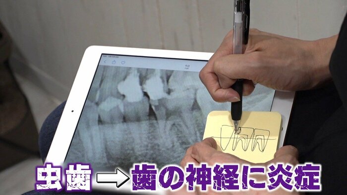 診察を行うと、虫歯が進行し歯の神経に炎症が起きていました。すぐに痛みの原因である神経を抜く治療を施します。