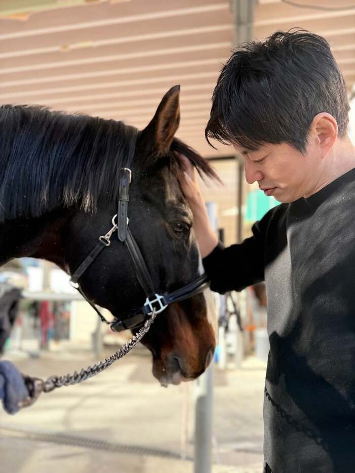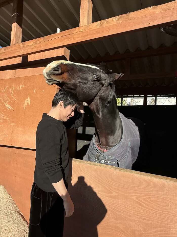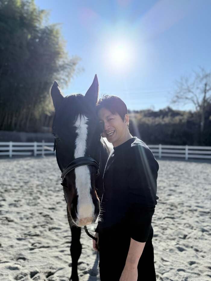 公開された写真には、黒い馬と向き合い、よしよしと頭をなでる大沢さんの姿が。大沢さんは優しいまなざしで馬の目を見つめていて、馬への深い愛情が感じられます。