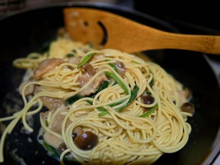 そこへパスタを投入し、よく絡めます。