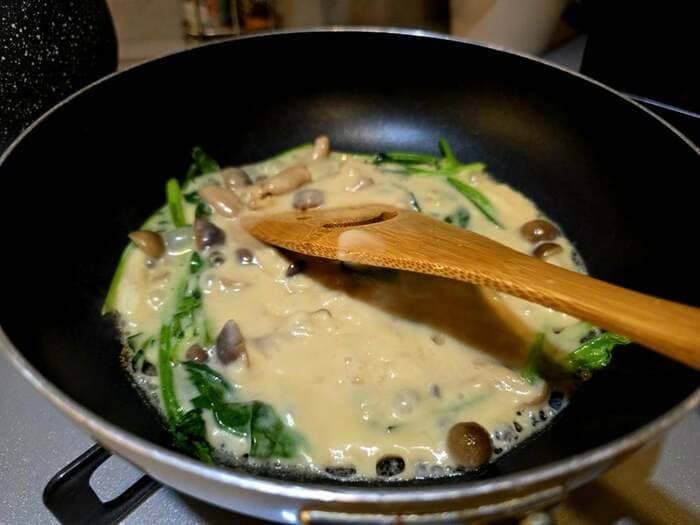 フライパンには、グツグツと煮立ったほうれん草としめじのホワイトソースが。