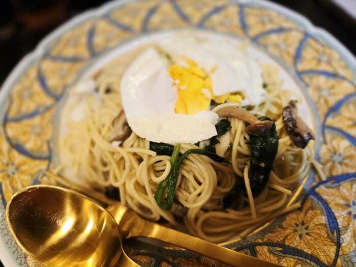 最後にエレガントな模様のお皿に盛り付け、一番上に目玉焼きをのせれば、“ほうれん草きのこのクリームパスタ”の完成です。