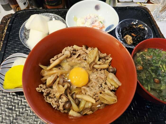 写真には、煮込んだお肉、しめじ、ネギの上に、生卵を落としたどんぶりがうつっています。