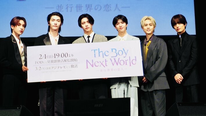 タイのBLドラマ『The Boy Next World』の日本リメイク版『The Boy Next World~並行世界の恋人~』が2月1日(日)よりFODで独占配信されることになり、主演の南雲奨馬さんと濱屋拓斗さん、共演の植村颯太さん、中山脩悟さん、原作のMAME氏が1月12日に都内で行われた記者発表会に出席。