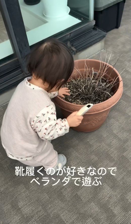 靴を履くことが好きだというにこりちゃん、まずはベランダ遊びから。植木鉢に興味津々です!