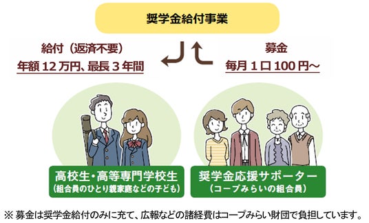募金は全額を奨学金給付に充て、運営にかかる諸経費はコープみらい財団が負担します。2026年度も、組合員同士の助け合いの輪をさらに広げて、奨学生の皆さんが充実した高校生活を送れるようサポートしてまいります。