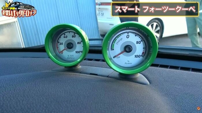 メーターは、日本ではあまり見かけない独立したデザインに。左がバッテリー残量計で、右がパワーメーターだということです。独創的なデザインに思わず「かわいいよね~」とコメント。