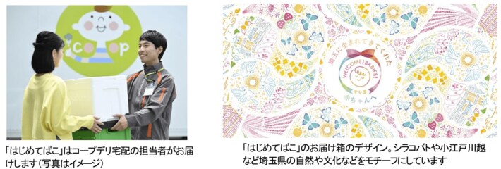 お届けする「はじめてばこ」には、本プロジェクトの趣旨に賛同いただいた各企業からの育児に役立つさまざまなプレゼントが詰め合わされています。 箱本体は、シラコバトや小江戸川越といった埼玉県の豊かな自然や文化をモチーフにした特製デザインとなっており、お届け後もお子様の成長の記録や思い出の品を大切に保管する「タイムカプセル」としてご活用いただけるのが特徴です。また、これらのお届けはコープみらいの宅配インフラを活用し、担当職員が直接ご家庭へ、お祝いの気持ちとともにお届けいたします。