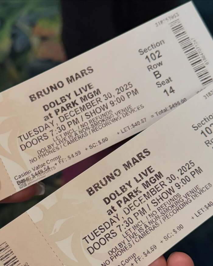 加えて、世界的ビッグ・アーティストであるブルーノ・マーズさんのライブチケットを持ったショットも公開し、ぜいたくな海外旅になったようです。