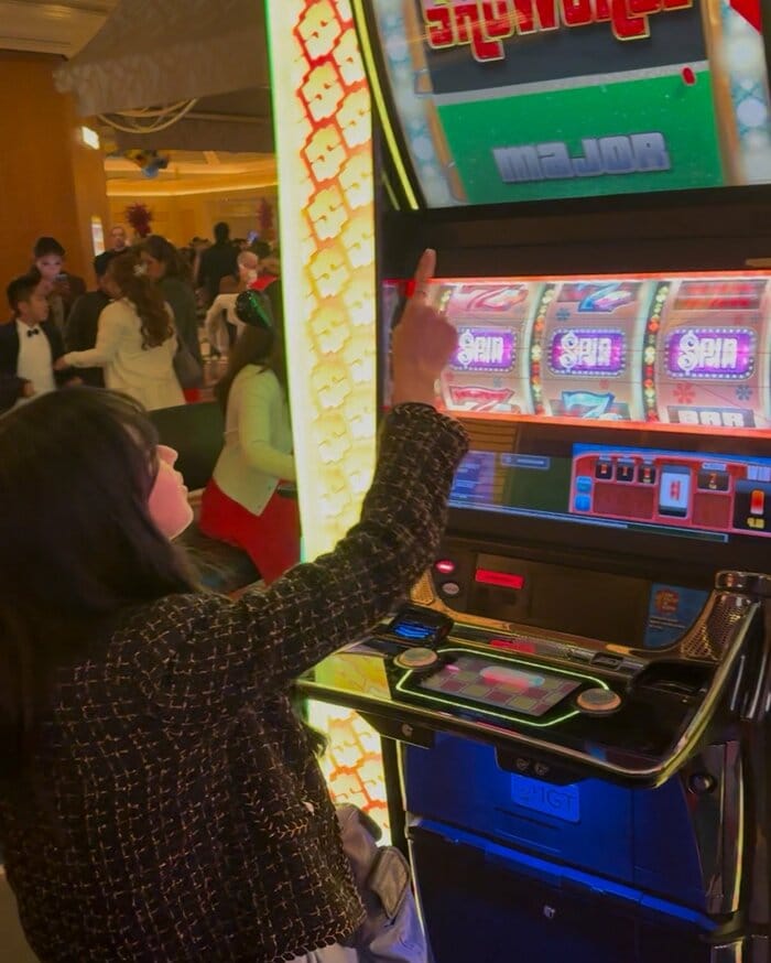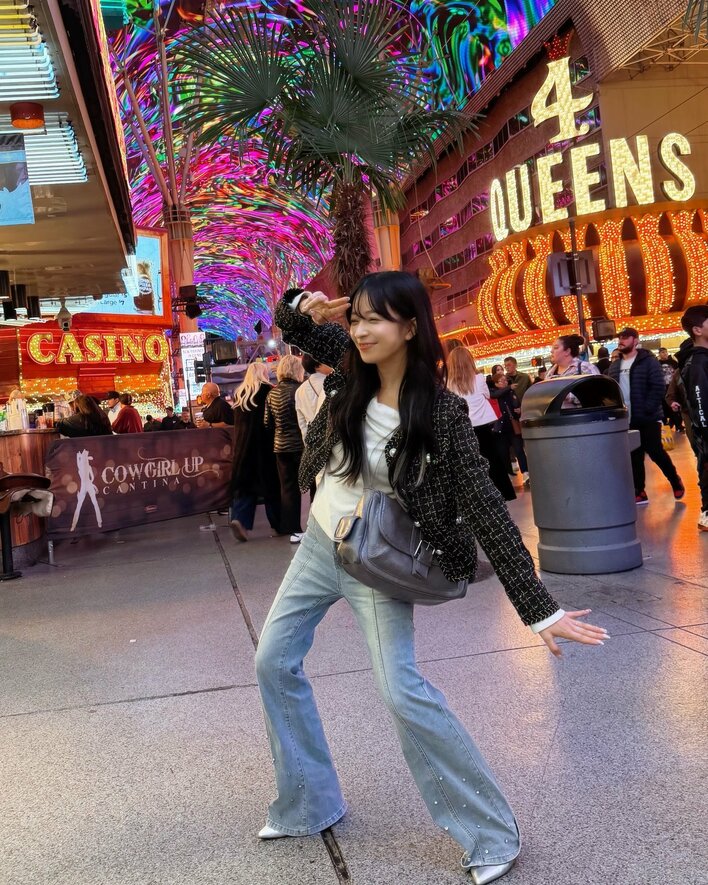 また、ツイードのジャケットにピタッとしたデニムを合わせたコーデで、楽しげなポーズを見せるさおりんさんの姿が。後ろにはきらびやかなカジノの看板があり、キラキラした外観にテンションが高まってしまいます。