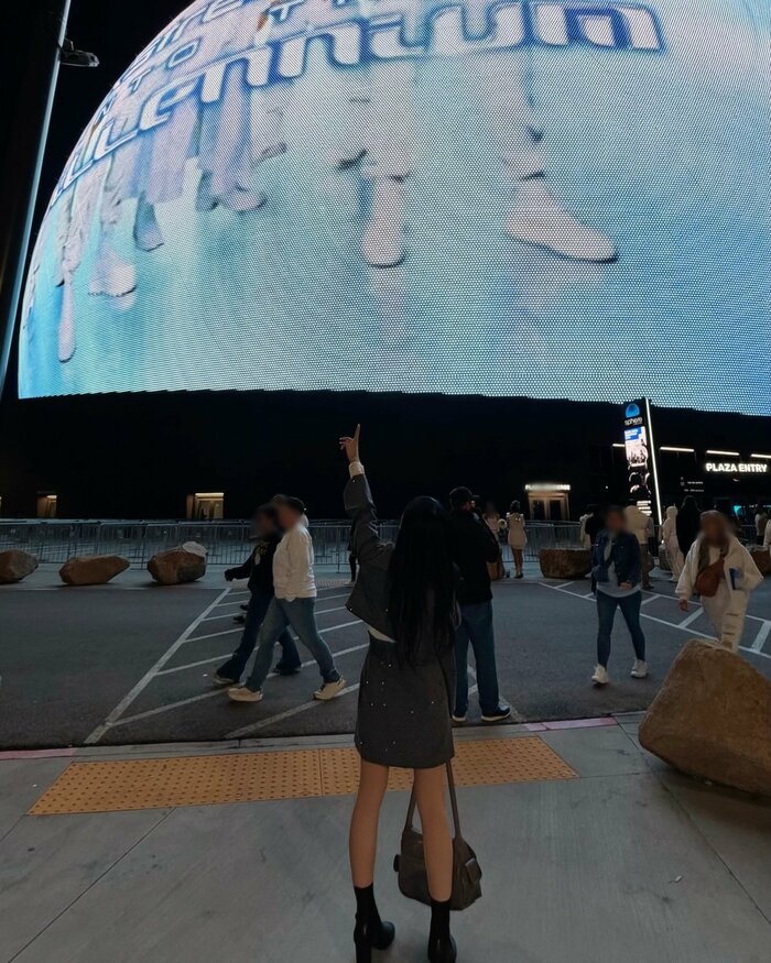さらに、ミニ丈のスカートで大迫力の画面を指さすショットも披露しています。非日常を存分に味わっているようです。