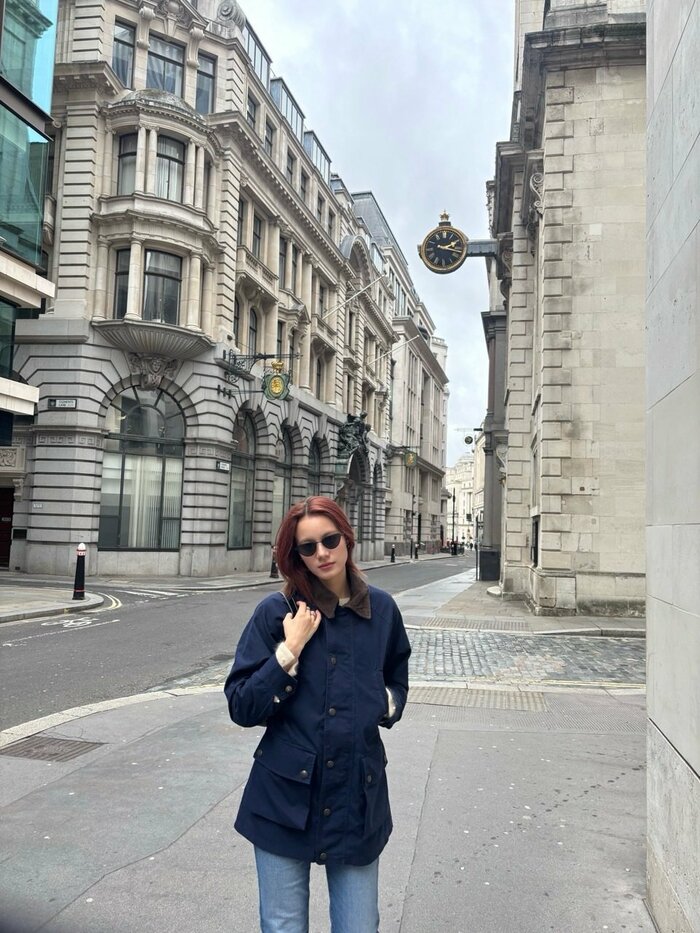 続けて、イギリスの街にたたずむクールなショット。NINAさんは、黒いサングラスにネイビーのコートを羽織り、オレンジ色の髪がふわっとなびいたオーラあふれる装いです。