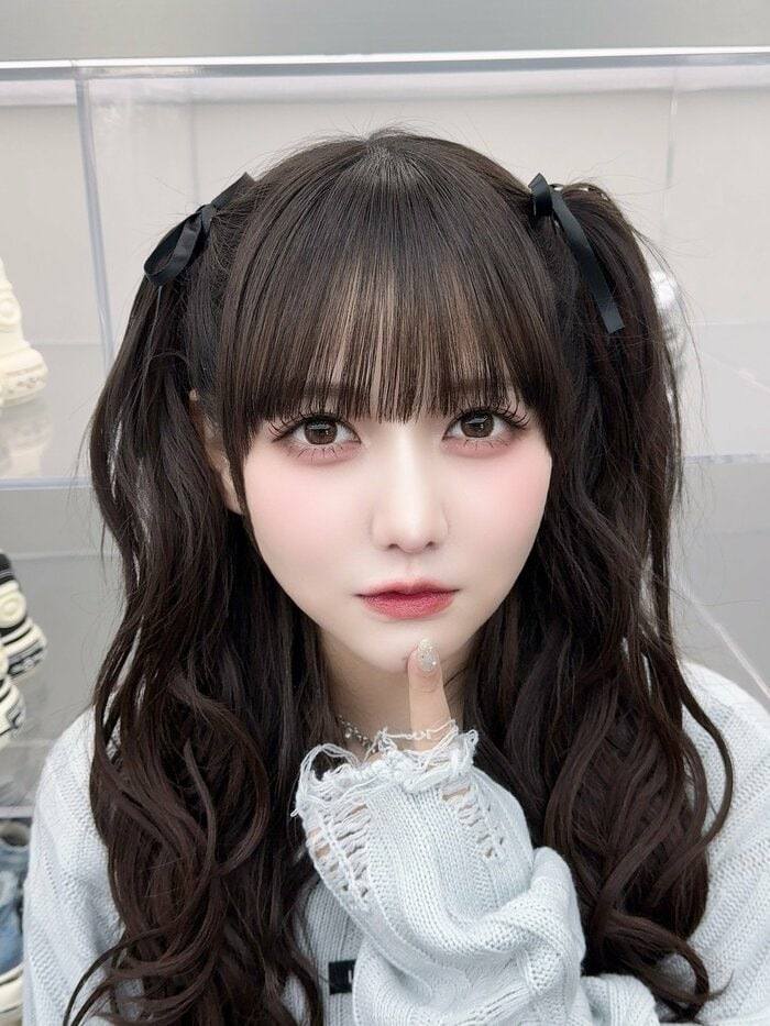 ハーフツインの毛先を持ち、口をすぼめたポーズを見せたショットなど、キュートさ満載です。