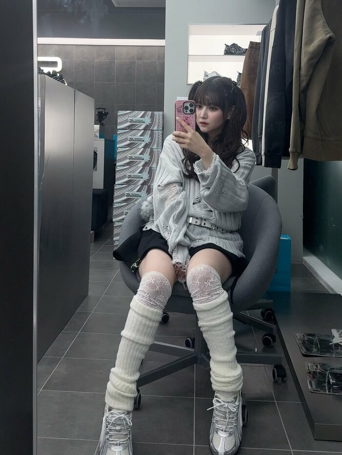 淡いブルーのトップスに黒のミニスカを合わせたコーデになっています。足元はレースの靴下にルーズソックスを組み合わせ、“絶対領域”を披露しています。