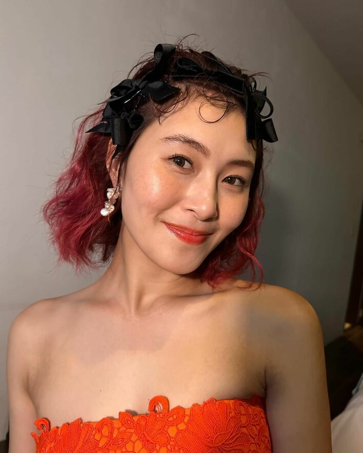 前撮りでは、目を引く明るいオレンジカラーのドレスを着用。くるくる巻かれたヘアの頭には黒いリボンがたくさんついています。お顔部分をよーく見るとチークの辺りにそばかすがあり、村上さんはコメントで「そばかすは、天然物」だと明かしていました。