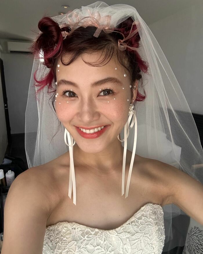真っ白なウェディングドレスを着た結婚式では、ピンクヘアを2つのお団子にまとめ、毛先をはねさせたおしゃれなスタイルに。目元には小さなパールがちりばめられていました。