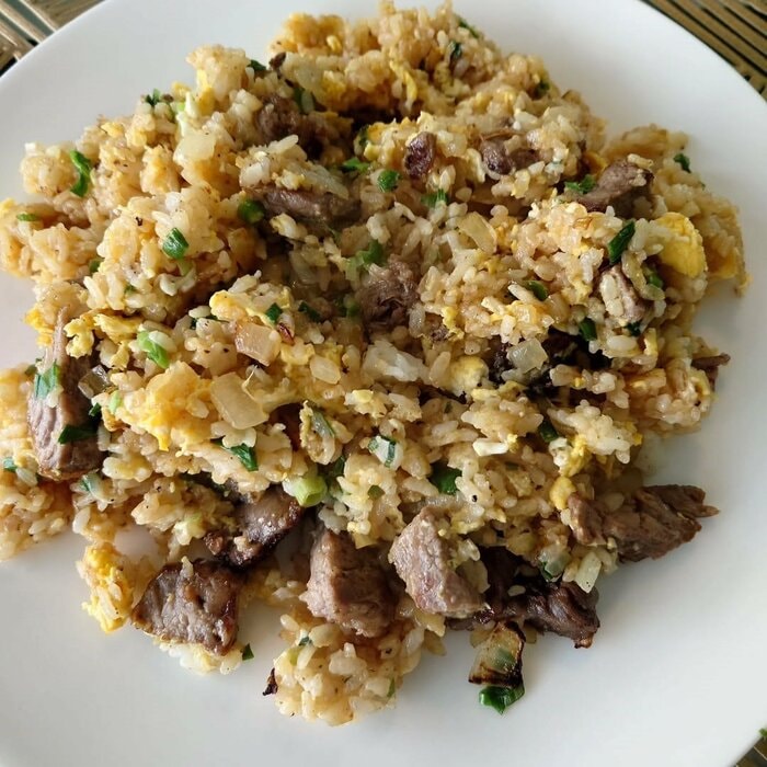 今回の投稿では「今日のお昼ご飯は残り物で ビーフ炒飯です。」とメニューを紹介。