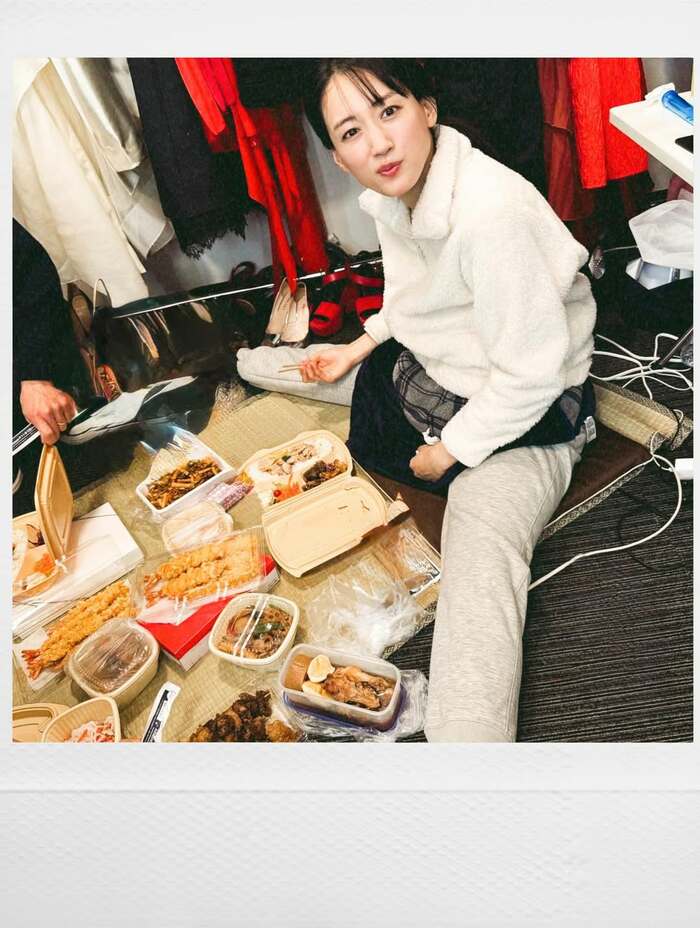 綾瀬さんはゴザの隅に引いた座布団の上に開脚するように座ったオフ感満載のスタイル。忙しい合間にもしっかりと食事を楽しんでいる様子でした。