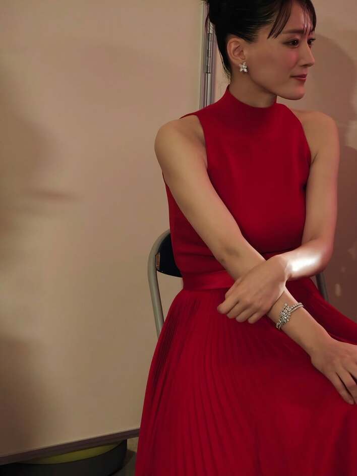 写真には、しなやかな腕が際立つ真っ赤なドレスを身にまとい、椅子に座る綾瀬さんの姿が。ふと横を向き、柔らかな表情を浮かべています。