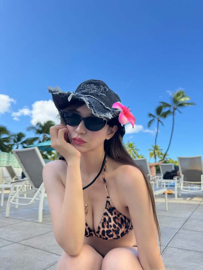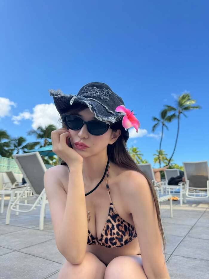 そして、今回の投稿では「ラブ上等♡って感じの写真じゃない?笑 久しぶりのハワイにテンション上がって豹柄の水着とか買ったけど(謎の帽子もw)恥ずかしすぎてホテルのプールで写真だけ撮って秒で着替えに戻りました」とつづり、ハワイのプールで撮影したショットを公開しています。