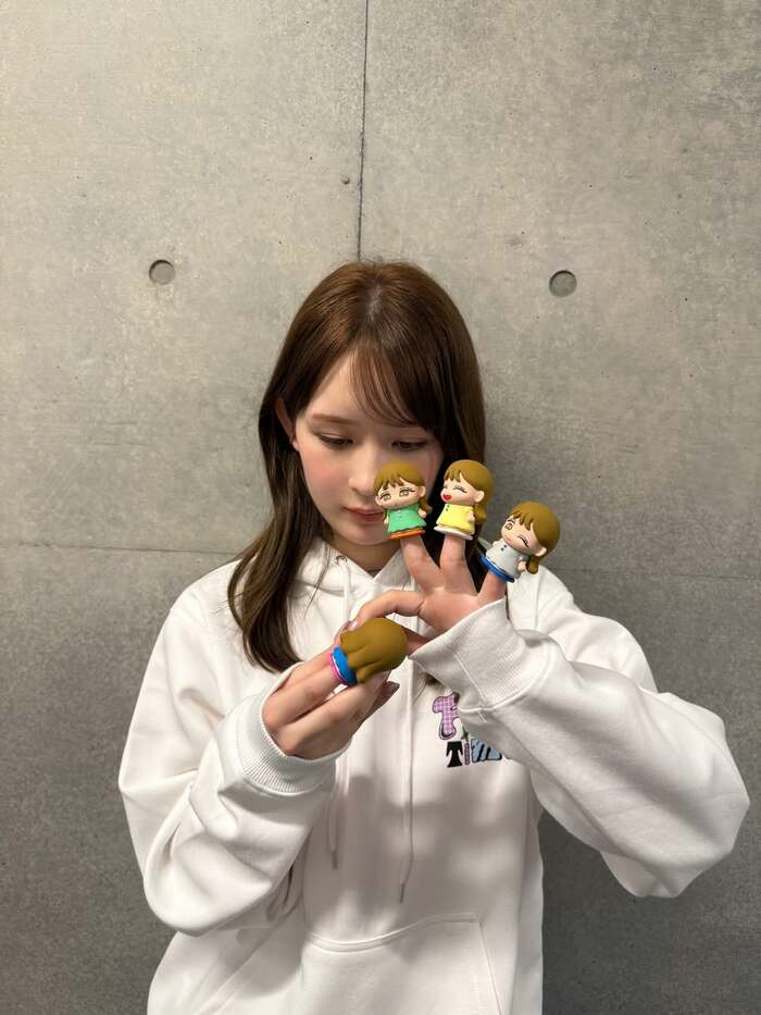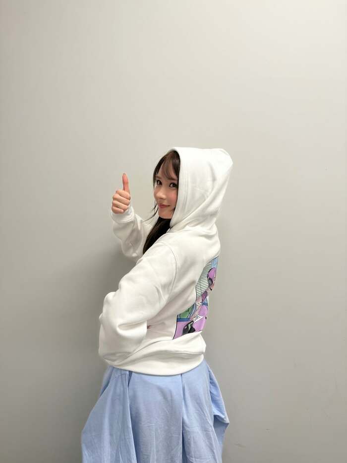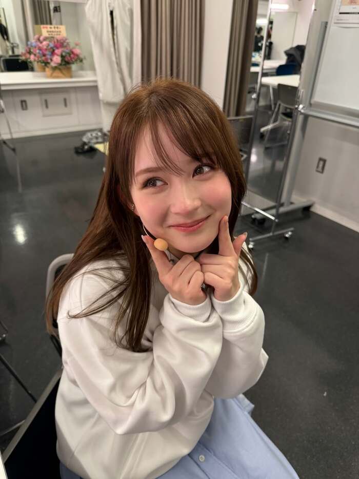 控室のような場所で撮影されたショットでは、白いパーカーに淡いブルーのスカートを合わせた畑さんが、両手を頬に添えてにんまりとした親しみやすい表情を見せています。