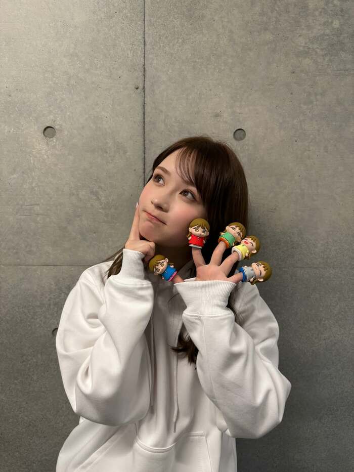 さらに、コンクリート壁を背景にした写真では、両手の指にカラフルな指人形をはめて何かを考えているような顔を浮かべる畑さん。頬に人差し指を添えて上を見つめたり…。