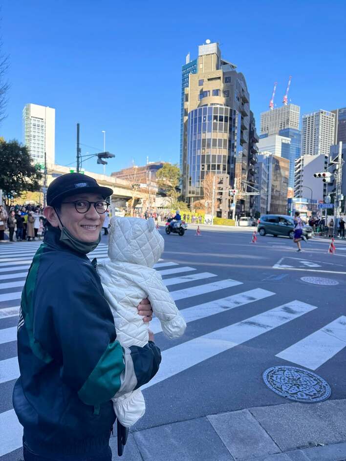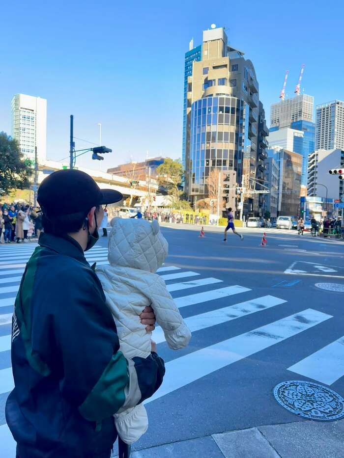 娘を抱っこしながら、沿道から箱根駅伝を応援するほっこりショットを公開しました。