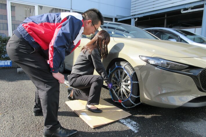 JAF広島支部では突然の降雪や路面凍結に備え、新しくタイヤチェーンを購入された方や、タイヤチェーンの取り付けに不安のある方に向けてJAFインストラクターがマンツーマンでお教えします。