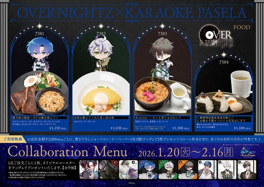 「OVERNIGHTZ」の3作発売を記念して、カラオケパセラにてコラボ開催が決定。メニューのご注文でオリジナルコースターを、さらにご利用金額に応じて書き下ろしショートストーリーペーパーをプレゼント。