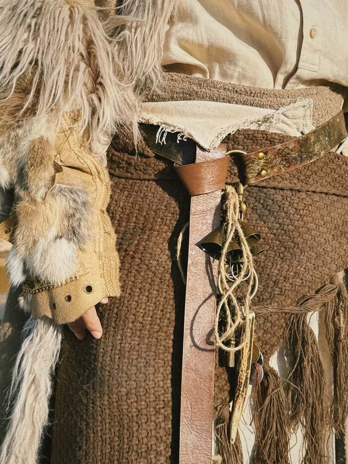 フリンジの付いた腰布や、革ベルトと金属カラーの鈴に、ファー付きのロングコートを重ね着したコーディネートが、ワイルド感があって素敵です。