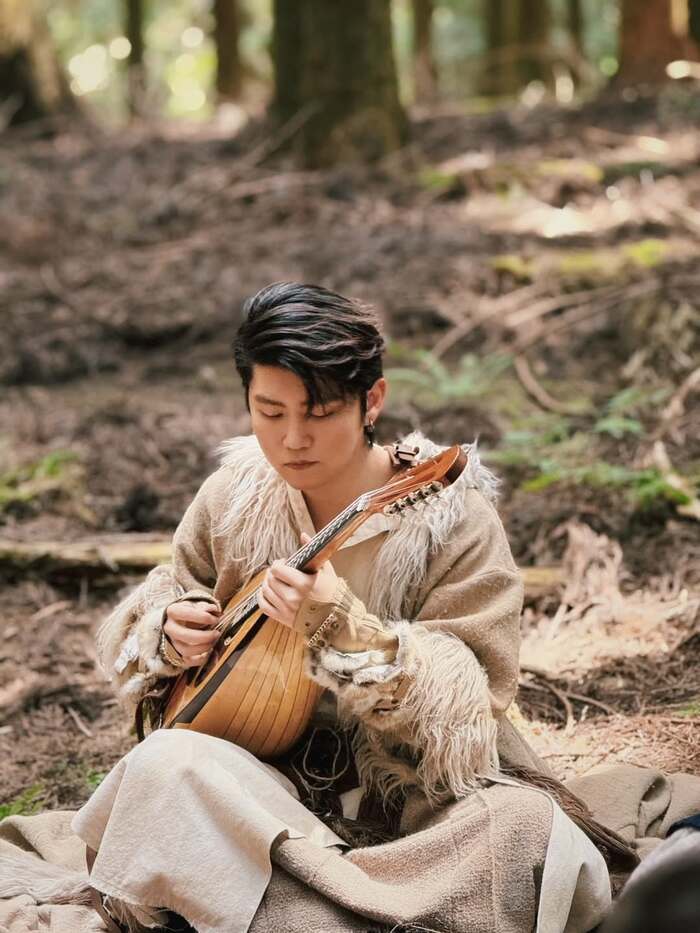 さらに、静けさが漂う森の中で、胴体が丸みを帯びた弦楽器を奏でているショットも。