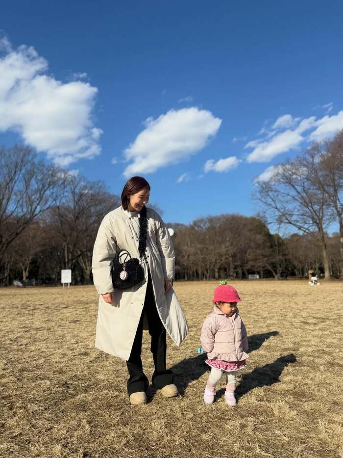 夫にプレゼントしてもらったという白のロングコートを羽織った西野さんが、にこりちゃんを優しげな表情で見守っています。