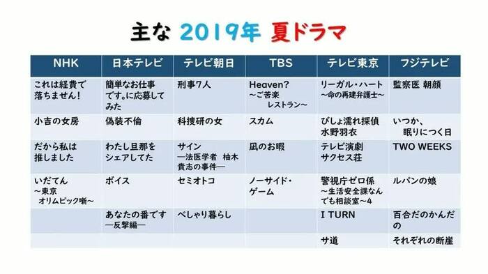今期のプライムタイムの新作は、「マンガ原作3本、小説原作4本。韓流ドラマリメイク3本、ノンフィクション原作1本と、11本すべてに原作があります。主演俳優に目を向けると、女性がアラサー、男性がアラフィフに集中していて、人気と実力が一番ある世代でもあります。夏枯れしないために安全路線で勝負していると思います」という木村の鋭い指摘から討論がスタート。