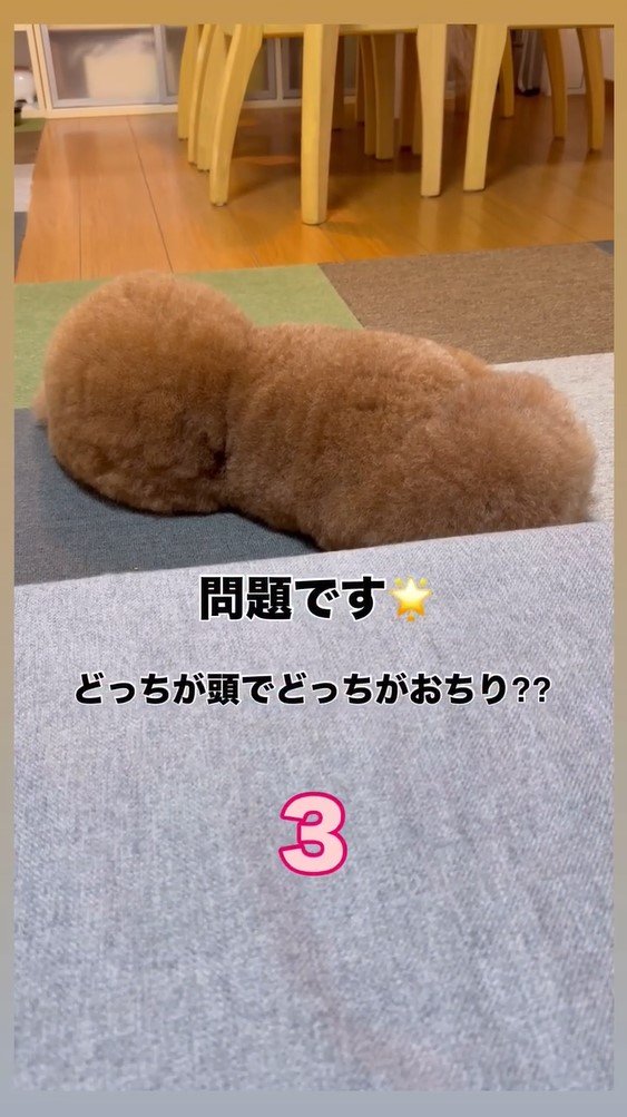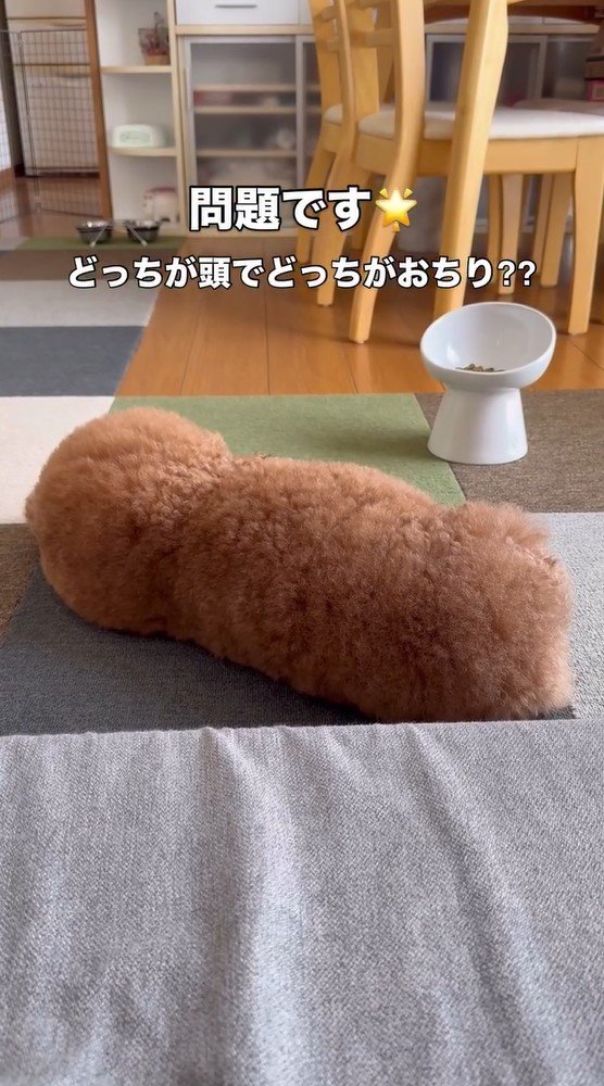 そこには、リビングのカーペットの上にゴロンと横になる、パルくんの後ろ姿が!右側も左側もモフモフとした丸い形になっていて、どちらが頭か、すぐには判断ができません。