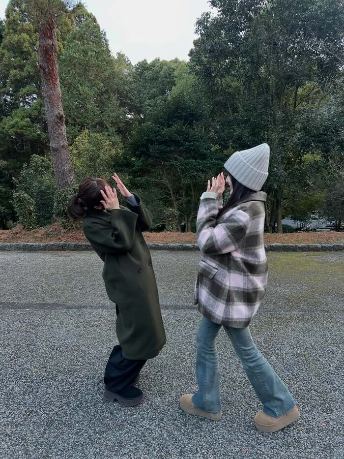カーキのロングコートを羽織った望結さんと手をつなぐ、チェック柄のコートにデニムパンツ、ニット帽をかぶったカジュアルコーデの紗来さん。