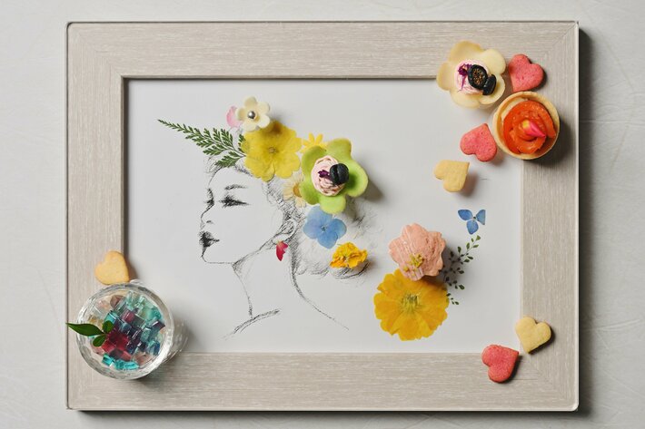 花をイメージした色とりどりのスイーツで、押し花アートにさらに彩りを加えます。