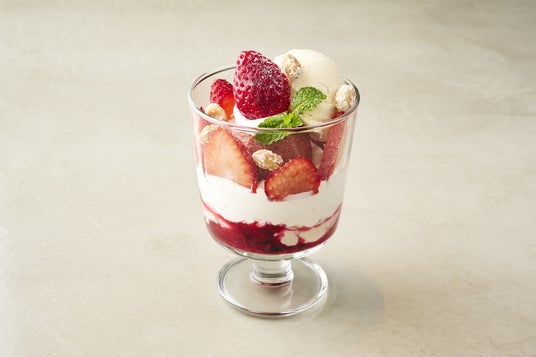 酸味のあるいちごに、豆乳で作られたブランマンジェやアイスを組み合わせ、炒り大豆の砂糖衣をトッピング。身体に優しいデザートです。