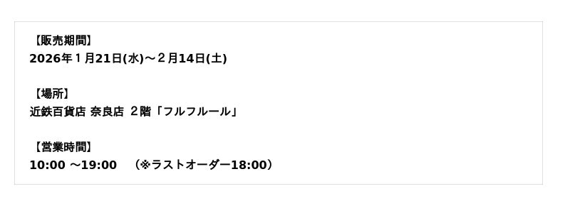 また「バレンタインショコラコレクション 2026」期間中、3階催会場でのお買いあげレシートを対象化粧品売場(1階・3階)でご提示いただき、近鉄奈良店インスタグラムをフォロー&リポストで化粧品のサンプルをプレゼントします 。