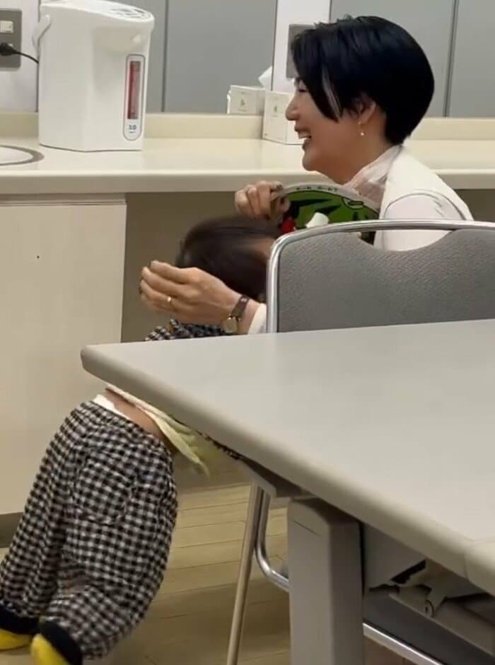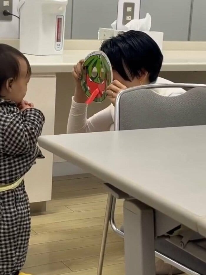 また、じっと見守る陽太くんの目の前で、栗原さんは舌がびよーんと飛び出したスイカのお顔になった姿を披露!空き時間に絵本を使って楽しませているようです。