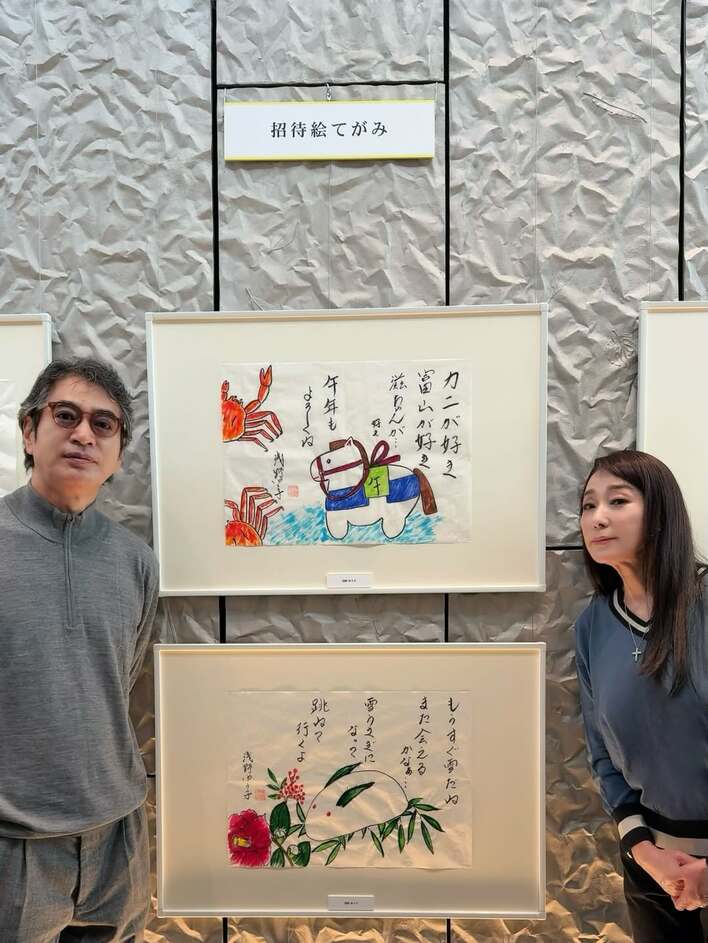富山では、自身が書いた絵てがみが展示されているのを見に行ったそうで、ウサギや馬の絵がえがかれた2枚の絵てがみを挟む形で、夫とたたずんだショットを披露しました。