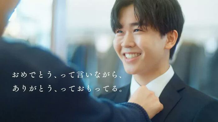 「おめでとう、って言いながら、ありがとう、っておもってる。」のコピーのとおり、子どもがフレッシャーズになる節目に、これまで子育てを通じて家族で多くの思い出を共有し、親自身も成長することができたという、子どもへの感謝の気持ちが描かれています。