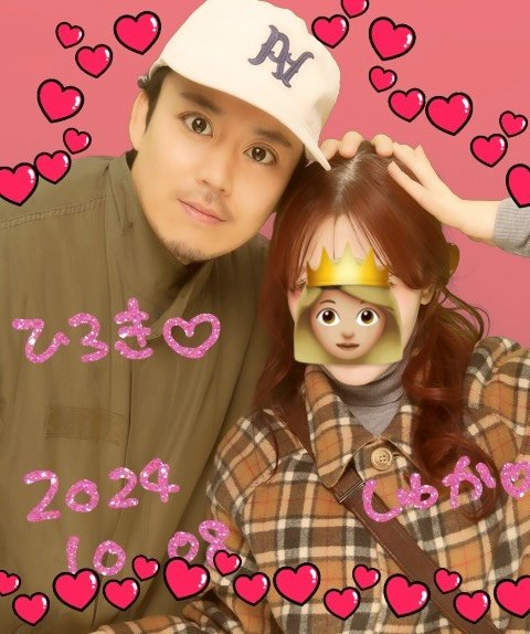 他にも、彼女さんの頭に手を添えた姿を小さなハートで囲み、それぞれに「ひろき♡」「しゅか♡」とかわいらしくお名前も。どれもピンクやハートをたっぷり使っていて、ラブラブさが存分に伝わってきますね。