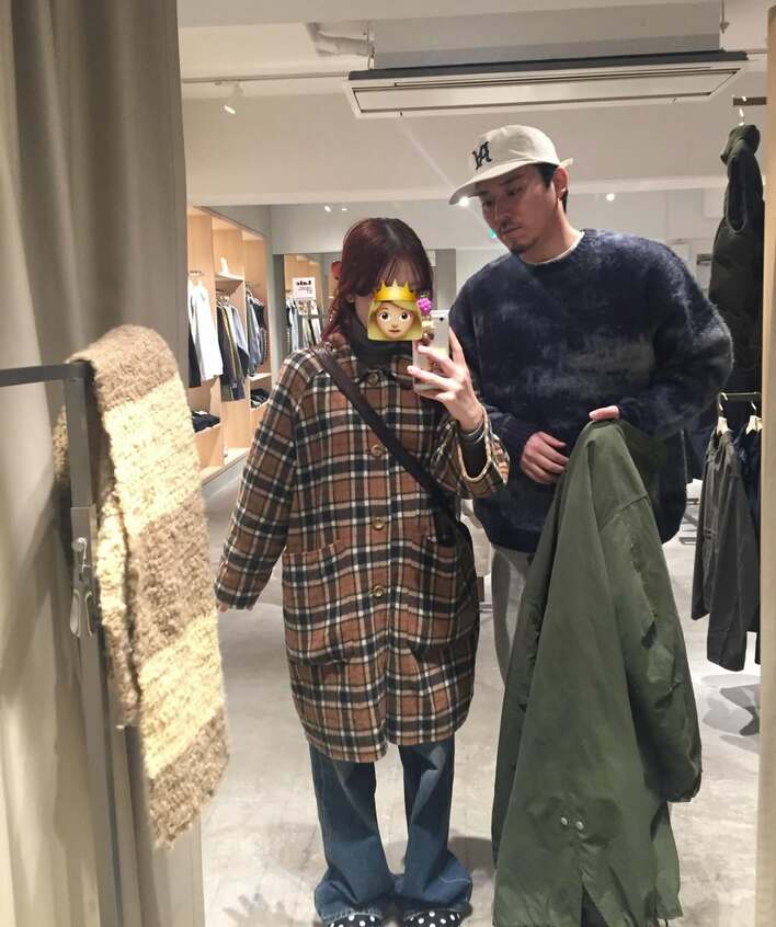 キャップをかぶった佐藤さんは、ブラウンのチェック柄のコートを着た彼女さんと横に並び、全身鏡の前でパシャリ!どうやら一緒にショッピングを楽しんでいるようです。