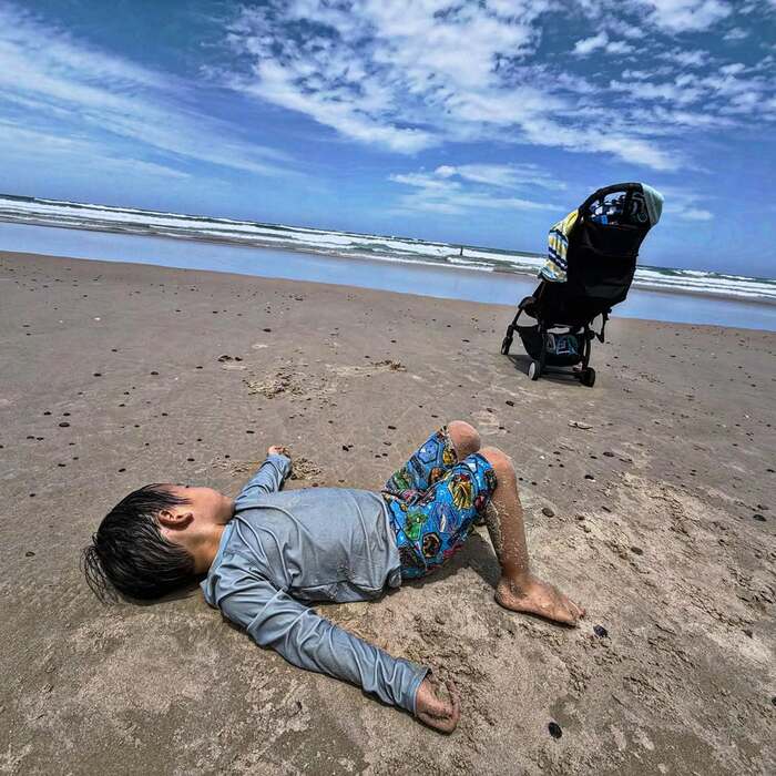 さらに、青空が広がる砂浜に息子がごろんと寝そべったショットも。海で思いっきり遊んだのか、水にぬれた体にはたくさんの砂が付いていて、とっても楽しそうです!