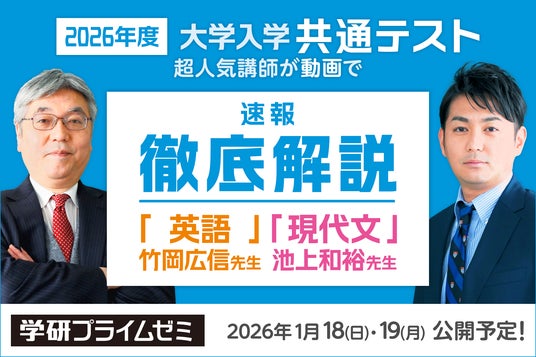 株式会社 学研ホールディングス(東京・品川/代表取締役社長:宮原博昭)のグループ会社、株式会社Gakken(東京・品川/代表取締役社長:南條達也)では、映像授業の難関大受験対策講座「学研プライムゼミ」の公式ウェブサイトにおいて、今年度の大学入学共通テスト「英語」「現代文」の問題を人気講師が速報動画で解説いたします。「英語」は2026年1月18日(日)・「現代文」は19日(月)より期間限定で無料公開予定です。なお、一般公開は同年1月31日まで。以降は学研のプライム講座会員(会員登録無料)限定視聴となります。