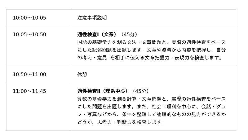 110分(適性検査I 45分、適性検査II 45分、休憩等20分)