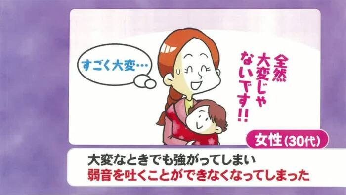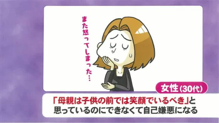 特に子育て世代は「#べきおばけ」に悩んでいる人が多いようで、「母親は子どもの前では笑顔でいる“べき”なのに、子どもを叱ってばかりで自己嫌悪」「“肝っ玉母ちゃん”キャラが定着してしまい、弱音を吐くことができなくなった」という30代女性の悩みが紹介された。