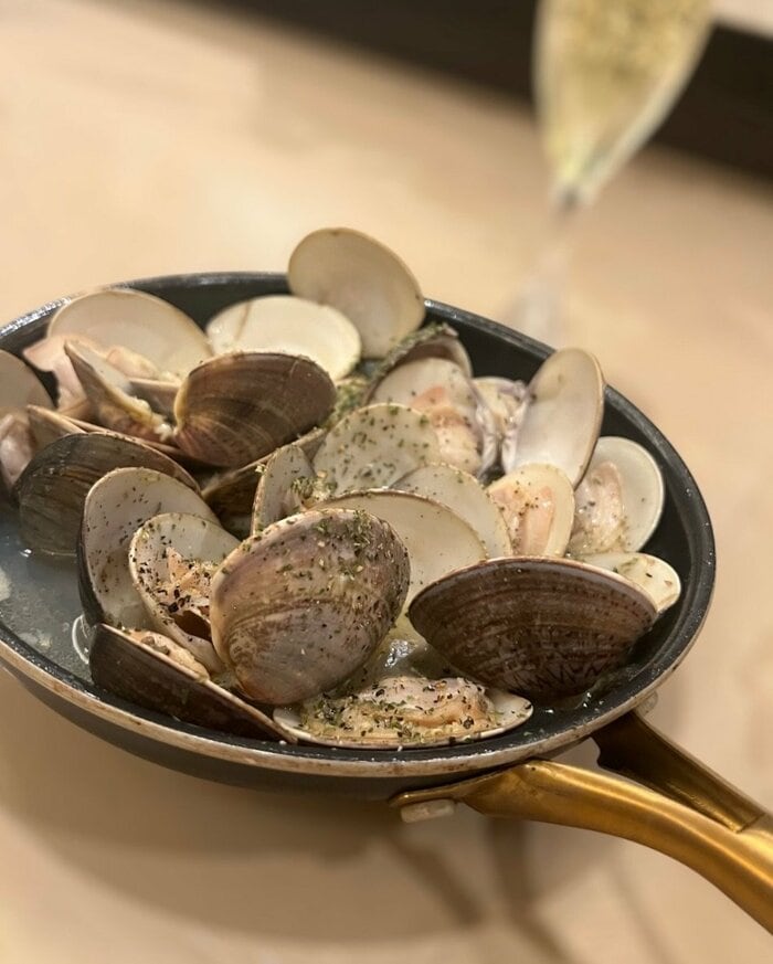 その「ワイン蒸し」を見てみると、フライパンの中には貝が開いて、うまみがぎゅっと詰まったような大ぶりな身が食欲をそそるハマグリが。